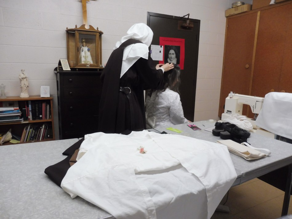 Preparing for the ceremony; in the foreground: the holy Habit awaits the return of the postulant after the first part of the ceremony.