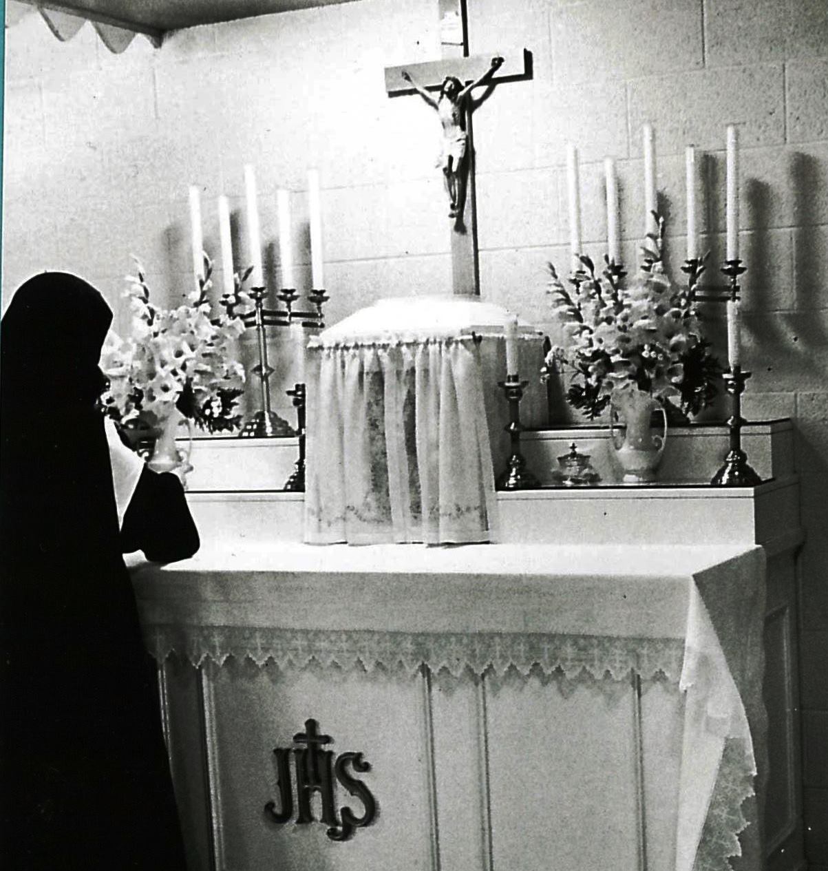 Our first chapel on Peninsula Drive, nestled in the bay window of a former “breakfast nook” in the remodeled house, had a simple wooden tabernacle and altar, and a choir so tiny that some nuns had to kneel in the adjacent hallway.