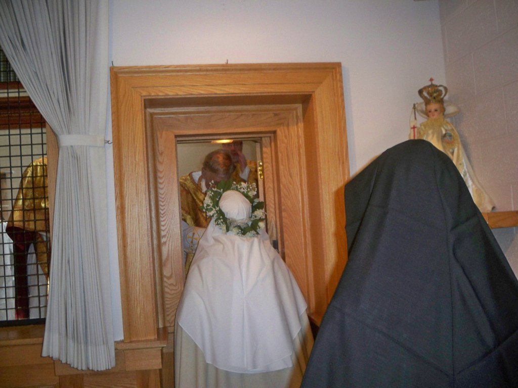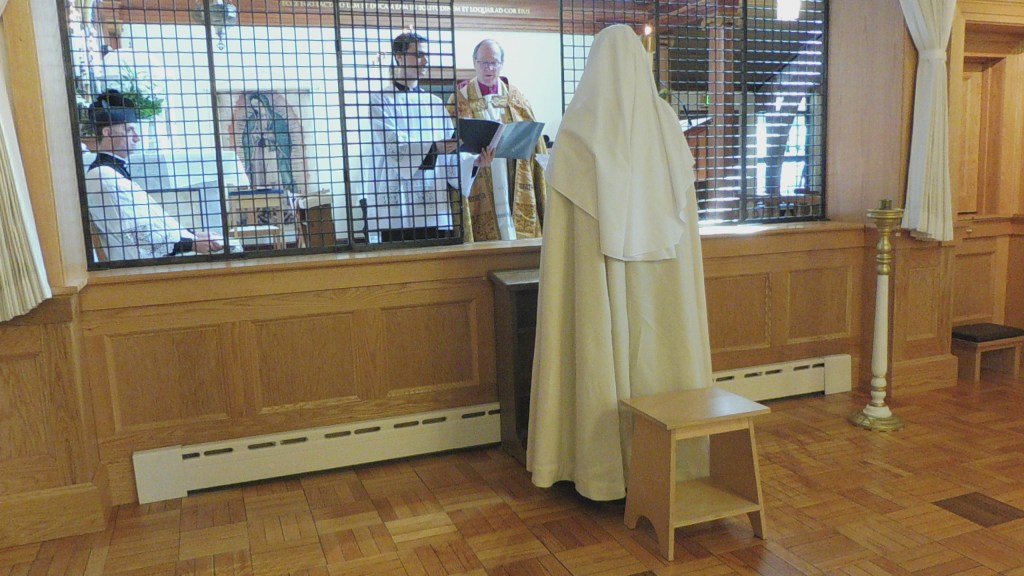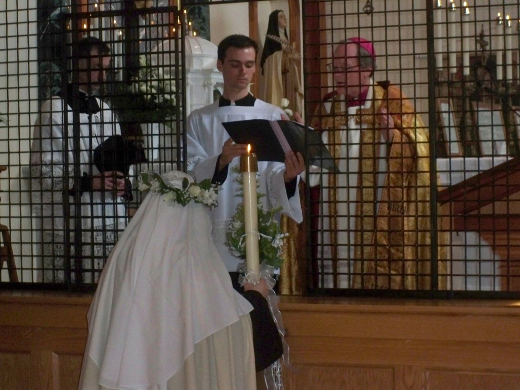 In the Novitiate Oratory before the ceremony.Bishop Walsh examines the novice’s intention and resolve.Sister makes her vows.Receiving the book of the Holy Rule and Constitutions.Bishop Walsh blesses the newly professed.Sister prostrates in the form of a cross while the community sings the Te Deum.Receiving her Spouse in Holy Communion.Solemn High MassThank you, Bishop Walsh, for joining us!
