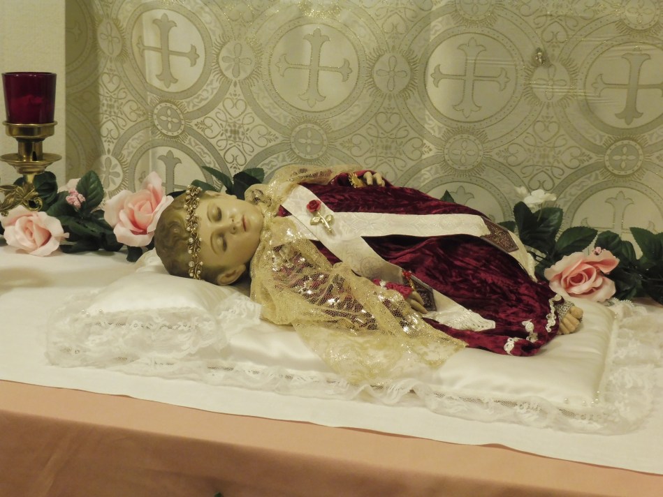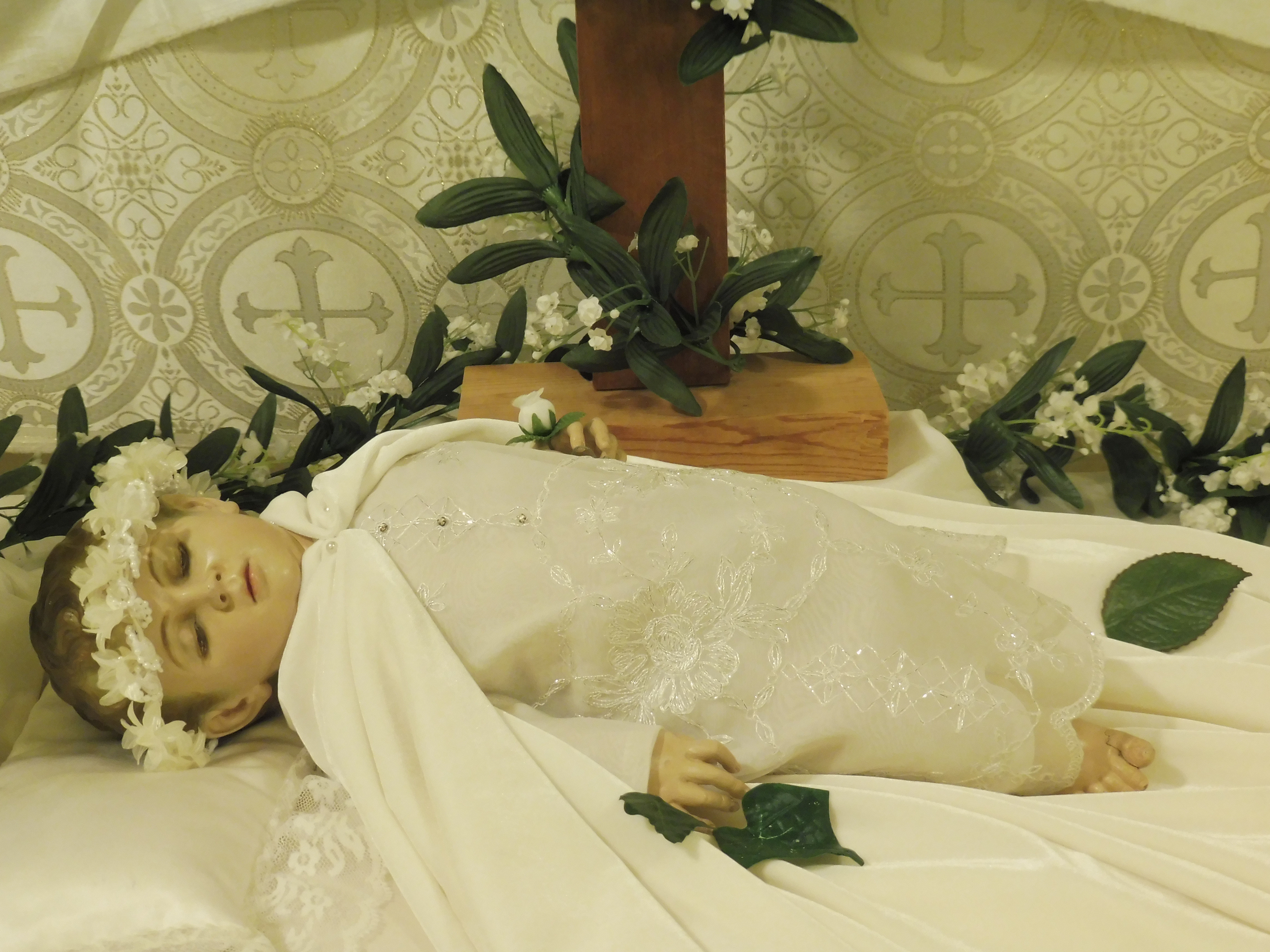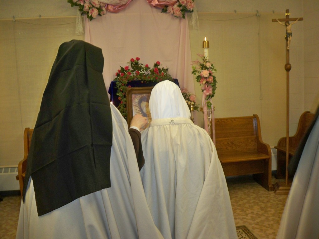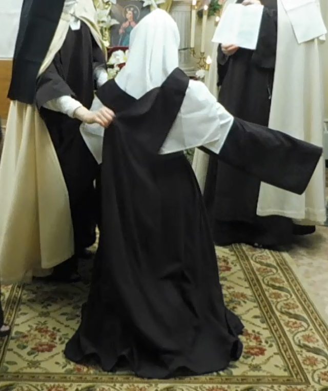 Wearing her mother’s bridal gown, the postulant is readied for the ceremony.The Sleeping Infant in the novitiate oratory wears rose, the color of joy.The Clothing ceremony takes place in the Chapter Room.A lock of the postulant’s hair is cut off.The new novice receives the cincture.The holy Scapular is added.The new novice is clothed in the mantle.Prostrate in the form of a cross, the new novice is covered with the mantle of the Mother Foundress.After receiving her religious name, the new novice is embraced by all.No worldly adornment can compare with the Holy Habit of Carmel! All is gladly left behind.